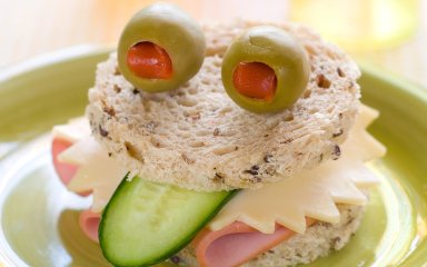 Веселе банькате жабенятко з хліба, вареної ковбаси або шинки, з маслин та огірка розвеселить дитину зранку. Можливо, персонаж на дитячій канапці так сподобається малечі, що вона схоче взяти його із собою до школи. Мої діти, коли я була у від’їзді, робили схожих жабенят і надсилали мені ранкові вітаннячка! А ще вони готували «равликів» із сосисок.