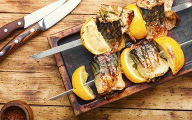 Такий шашлик зі скумбрії чудово поєднується зі свіжими овочами, легкими салатами і соусами на основі йогурту.