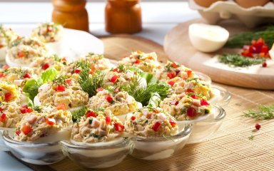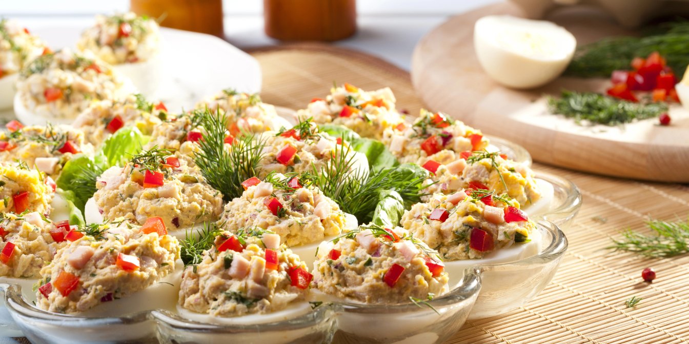 Щодо смаку фаршированих яєць, ви можете замінити або доповнити традиційну основу з майонезу легкими альтернативами. Наприклад, натуральним йогуртом, сметаною, пюре з авокадо тощо.