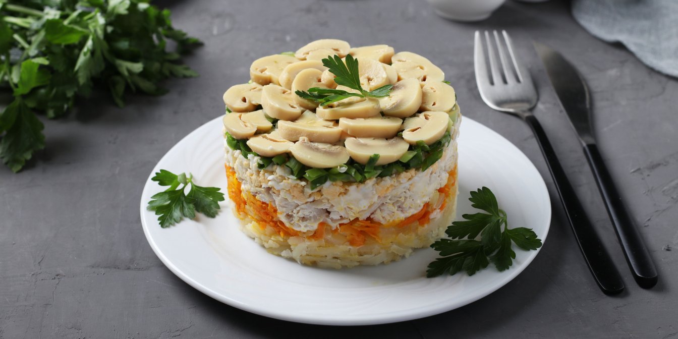 Унікальність багатошарових салатів полягає в тому, що ви можете використовувати різні пари інгредієнтів, кожен раз створюючи нову страву. Пані Алла постаралася і поєднала найкращі смаки: ніжні картоплю, курятину та варені яйця, солодкі моркву та консервовану кукурудзу, пікантні мариновану цибулю і смажені печериці, свіжий огірок. Смакота!