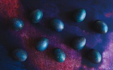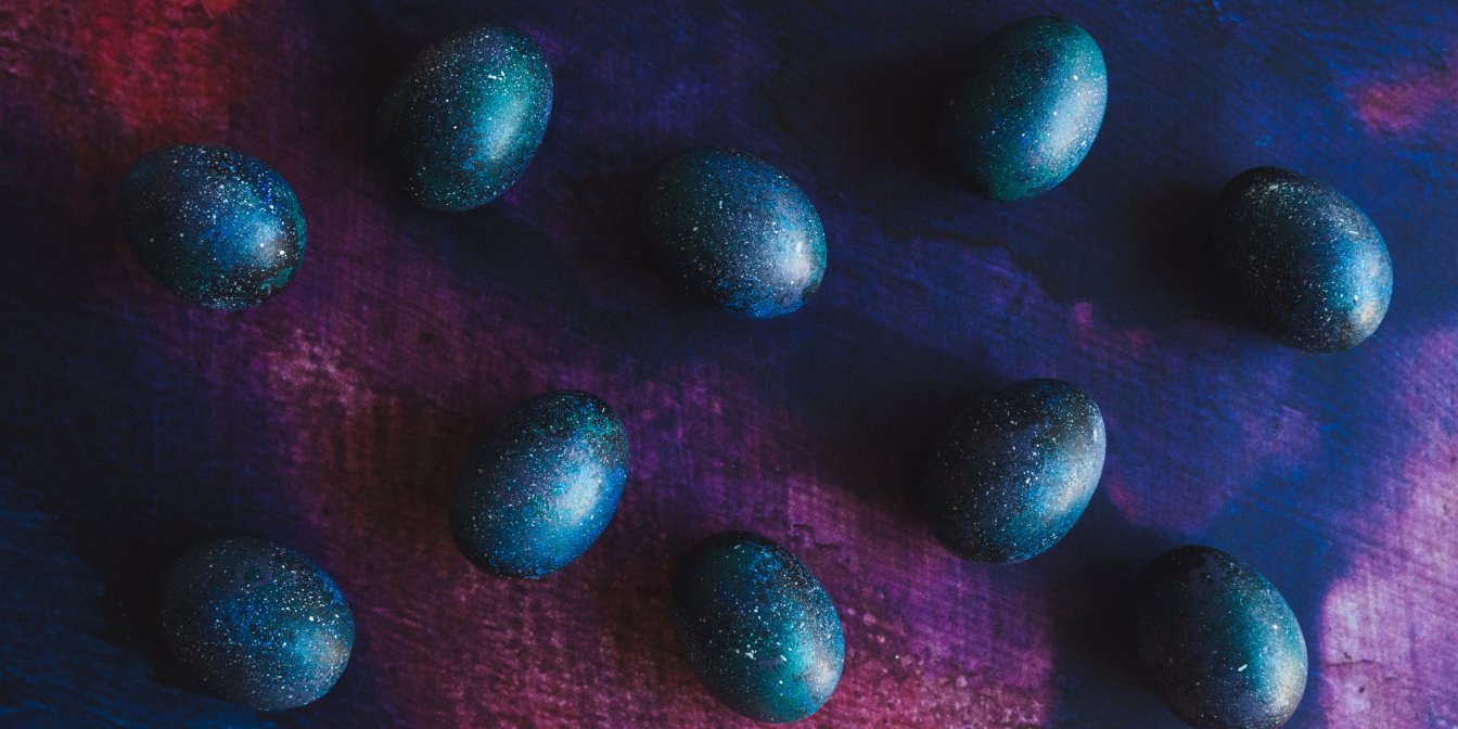 Глибокий колір нічного космосу з мерехтінням зірок можна отримати завдяки вину. Налийте в каструлю вино, покладіть яйця, влийте 1-2 столові ложки оцту 9%, зваріть яйця круто (10 хвилин після закипання), вимкніть вогонь і залиште настоюватися на ніч.