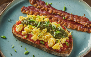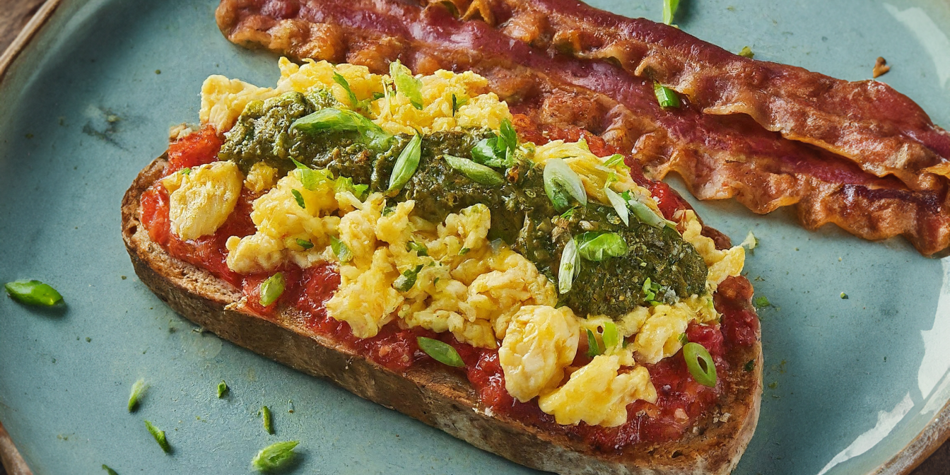 Намастіть скибку батона вершковим маслом і підсушіть на пательні намащеною частиною донизу. Викладіть на неї готовий скрембл, а поряд — смажений хрусткий бекон. Полийте бовтанку сальсою та соусом песто. Притрусіть зеленою цибулею.