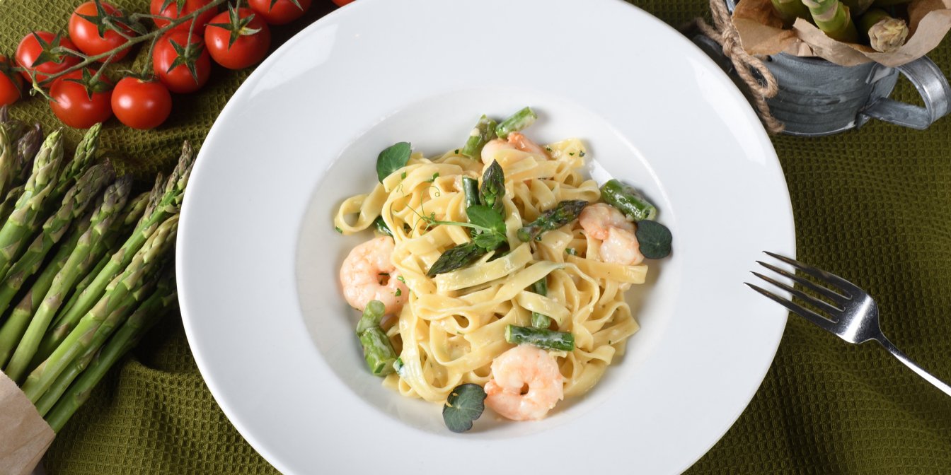 Ця паста з морепродуктами та спаржею — справжнє поєднання ніжності, свіжості та багатогранності. Морепродукти додають страві неймовірного смаку й аромату, а спаржа, що має ніжний смак та хрустку текстуру, — весняної свіжості. Усе разом об’єднує кремово-вершковий соус, який чудово поєднується з морепродуктами та спаржею.