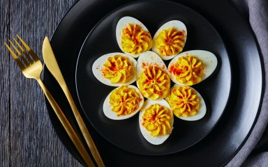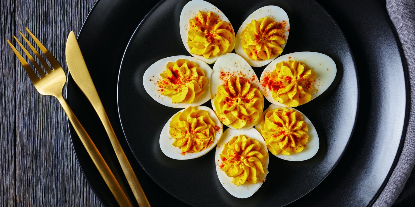 Наш рецепт — чи не найпростіший. Яєчні жовтки для начинки змішуємо з майонезом, оцтом, гірчицею, солимо й перчимо, прикрашаємо копченою паприкою. Замість майонезу можна брати густу сметану або грецький йогурт, різновид гірчиці — на ваш смак.