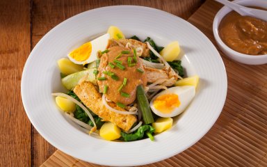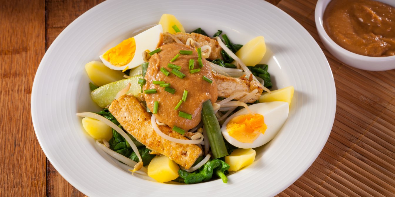 Уявіть собі велику тарілку, наповнену барвистими овочами, вареними яйцями та смаженим тофу. Вже буркотить у шлунку? А це ми ще не розповіли про родзинку страви — арахісовий соус сате, через який ви забудете про сон.