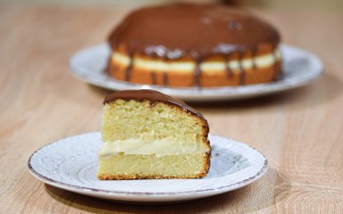 Знаменитий бостонський торт — це м’який, наче кремовий, бісквіт і дуже незвичайний заварний крем, у який додамо трохи вершкового масла. Ідеальний бісквіт не треба розрізати, він змащується кремом зверху, а потім покривається шоколадною глазур’ю.