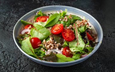 Гречка, як показує практика десятків років, ніколи не набридає. Вона була, є і буде завжди. Існує чимало способів використати її не в прямому призначенні, а в дуже несподіваних стравах. Цей салат з помідорами та невеликою кількістю бекону — один з них.