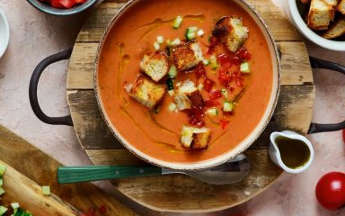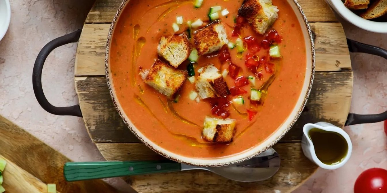 Холодний томатний суп з крутонами та сиром: освіжить у спеку