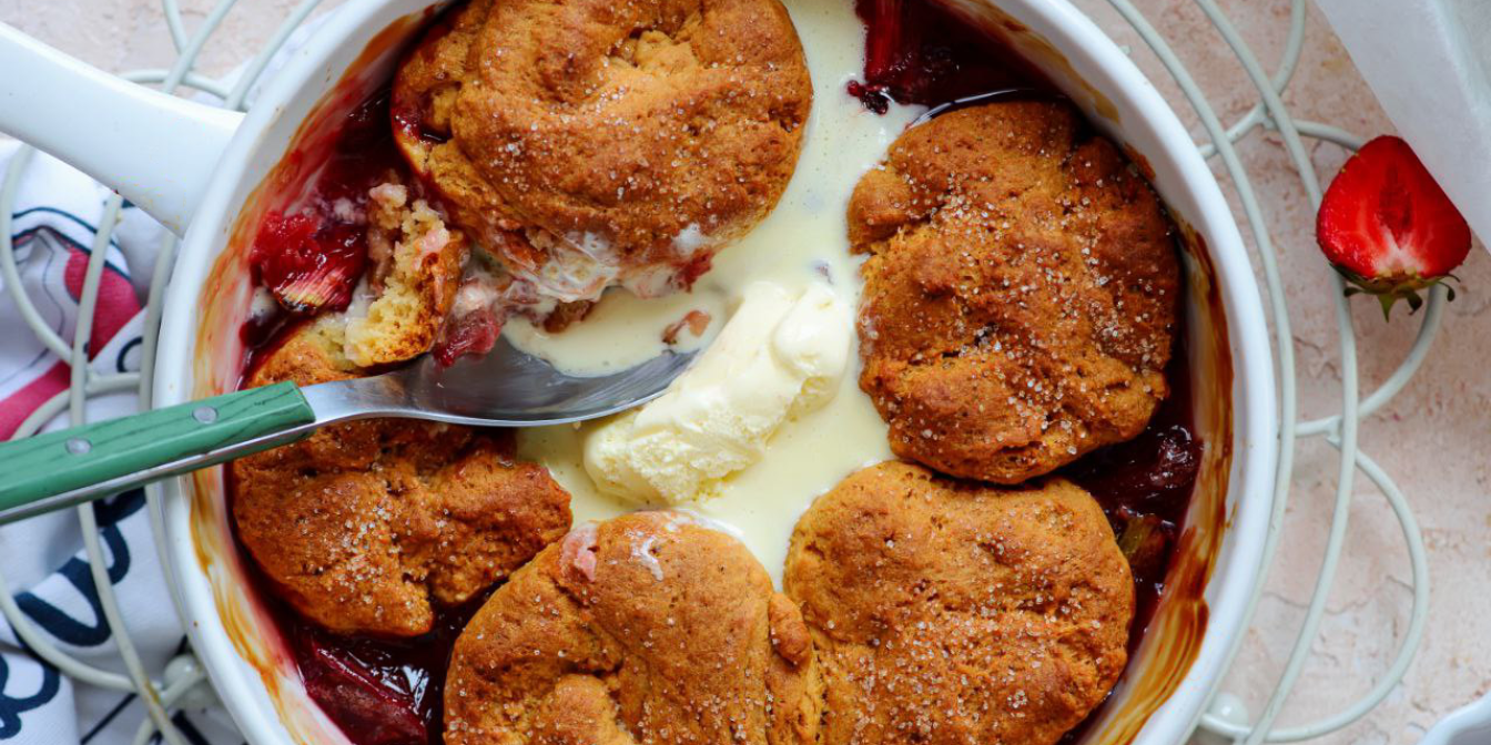 Медовий коблер з ревенем і полуницею — найсмачніший пиріг червня