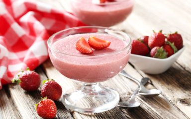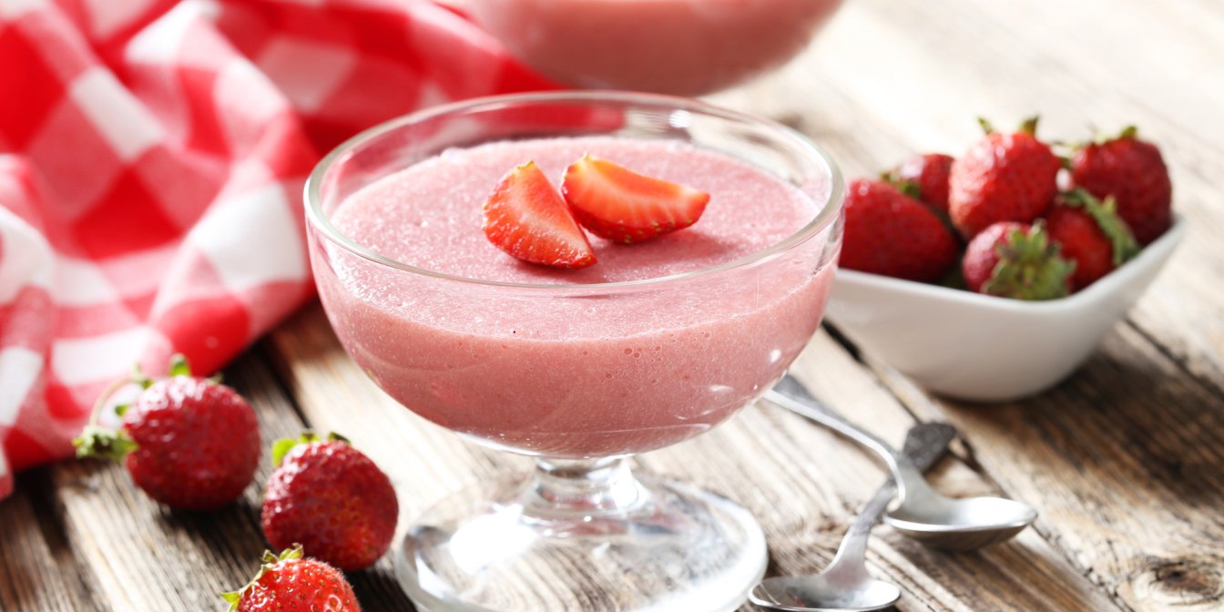 Розкладіть десерт по формах, поставте в холодильник щонайменше на 2 години. Прикрасьте десерт нарізаною полуницею.