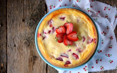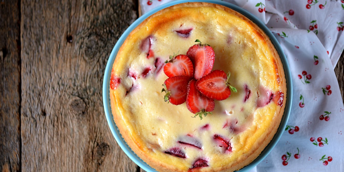 Клафуті — це французький заварний пиріг із начинкою (зазвичай чорною вишнею), який швидко приготувати на сніданок або десерт. Ольга Мироненко пропонує взяти сезонну полуницю, хоча підійдуть будь-які ягоди (ожина, малина) або кісточкові фрукти (абрикоси, сливи, персики).