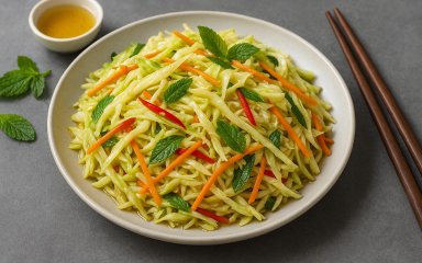 В’єтнамський салат — це завжди щось дивовижне! Цього разу жодної екзотики: всі складники можна купити в будь-якій крамниці або ятці. Лайм ви можете на бажання замінити лимоном, а замість свіжої м’яти додати сушену.