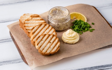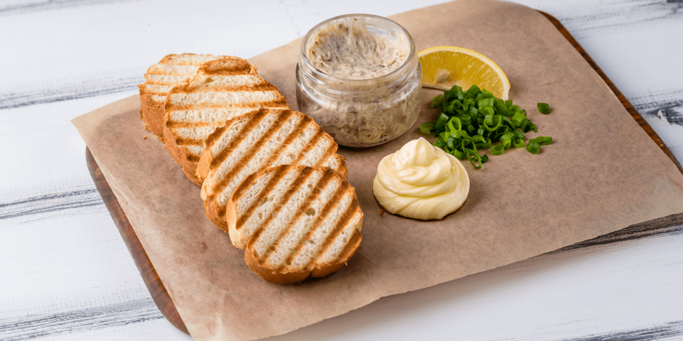Готовий форшмак для подачі формуємо в кульки. Хліб підсушуємо на грилі або на пательні та викладаємо на посуд. Поруч кладемо м’яке вершкове масло, нарізану зелену цибулю та дольки лимона.