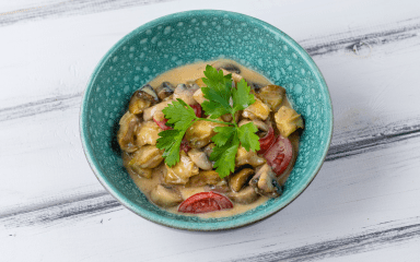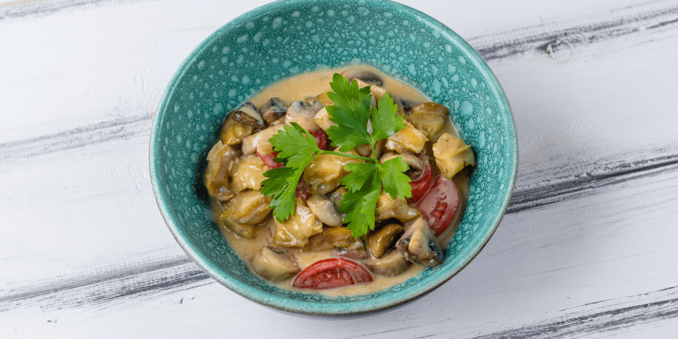 М’ясо рапана з печерицями та томатами у вершковому соусі