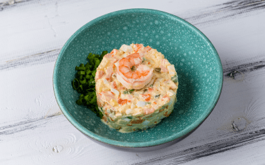 Це незвичайна варіація класичного «Олів’є», що стане родзинкою святкового столу. Креветка додає салату пікантності та неповторного морського аромату, роблячи його вишуканим і святковим.