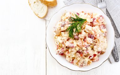 Використайте будь-яку доступну морську білу рибу, додайте варені яйця, солодкий перчик, майонез з гірчицею — і отримаєте ситний білковий салат, що виступає самостійною стравою. Салат з філе білої риби — для тих, хто зголоднів!