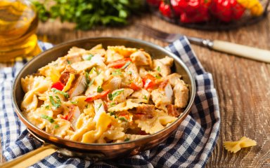 Для цього рецепта пасти з овочами Джеймі Олівер пропонує вибрати улюблені макарони й солодкі перці, червону цибулю, стиглі помідори та м’який сир фета. А доповнять цей чудовий ансамбль ароматне орегано і крапля червоного винного оцту. Легка в приготуванні та неймовірно смачна паста з овочами обов’язково стане зіркою вашого літнього меню!