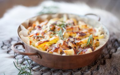 Уже давно і добре відомо, що м’ясо по-французьки — не страва французької кухні. Але це не має жодного значення! Страва урочиста й завжди виходить вдалою. На шар відвареної картоплі покладемо шар свинини, потім обсмажену з маслом цибулю і тертий твердий сир. Смакота та й годі!