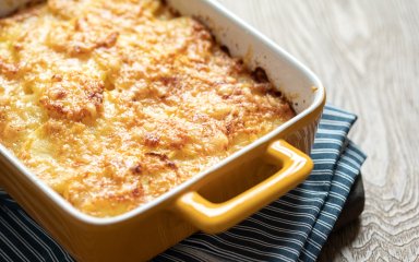 Запікайте у розігрітій до 180°C духовці 15-20 хвилин, поки не з’явиться рум’яна скоринка. Готову запіканку прикрасьте зеленню.