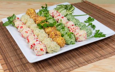 Підготуйте три варіанти посипки: з крабовими паличками, зеленню та кунжутом. Для першої посипки подрібніть крабові палички та обкачайте в них частину кульок. Для другої — зелень помийте, обсушіть і дрібно поріжте, а потім обкачайте в ній іншу частину кульок, а решту — у кунжуті. Покладіть у холодильник на кілька годин.