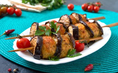 На шампури нанизати фарш, чергуючи з баклажаном. Смажити на грилі до готовності, подавати із зеленню.