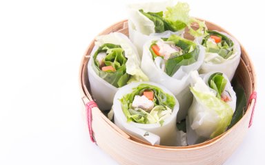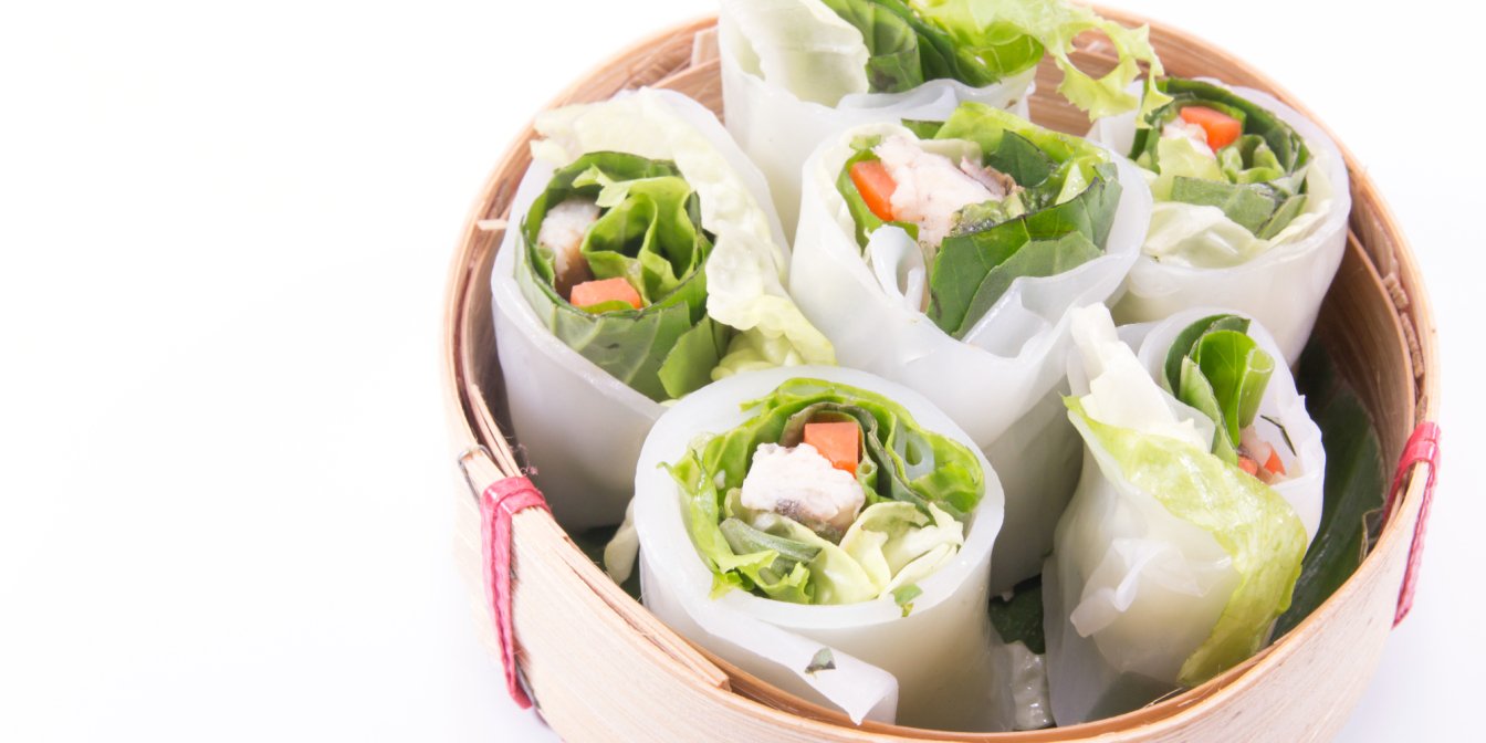 Спринг-роли загортаємо в рисовий папір, а до начинки додаємо рисову локшину. Також для начинки, крім традиційного огірка й авокадо, слугують шматочки листя салату. Саме тому ці роли досить легкі та свіжі.