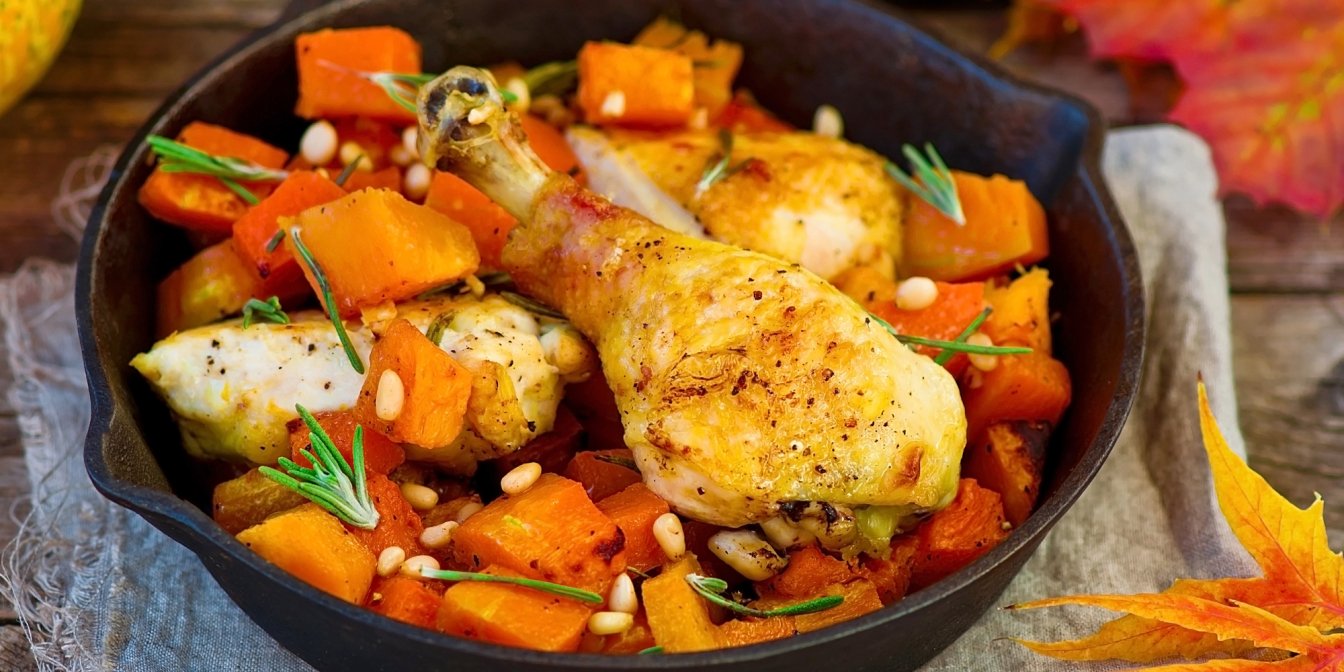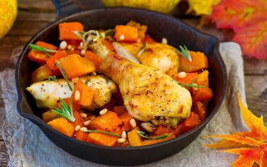 Гарбузи вже достигли та тільки й чекають, щоб ми приготували з них щось смачненьке. Спробуйте запекти з гарбузом, солодким перцем, квасолею і помідорами курячі гомілки. Це чудове осіннє рагу, що містить море вітамінів і ще просто втілює ідею ситної смачної вечері.