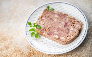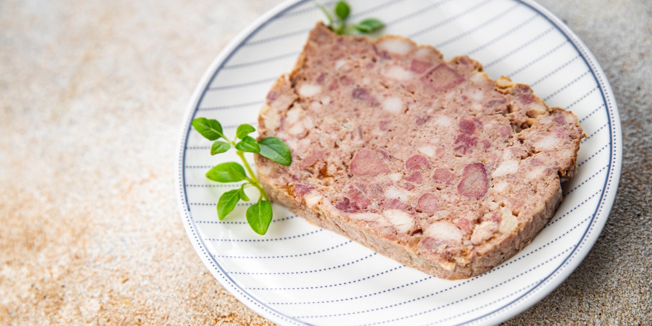 М’ясний буханець? Ні. Ковбаса? Аж ніяк. Зельц? Знову не вгадали! Перед вами французька страва терин, приготована з трьох видів м’яса. Основа цього рецепта — м’ясо кролика, а для декору використовуємо довгі смужки бекону. У маринад додаємо трішки коньяку.