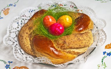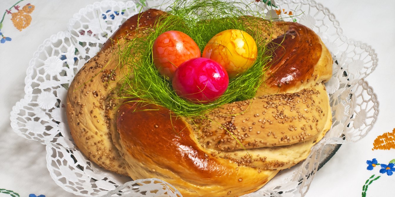 Великодній хліб — це підсолоджене дріжджове тісто з фарбованими яйцями, запеченими прямо у тісті! Незвично, правда? Але від цього не менш смачно!