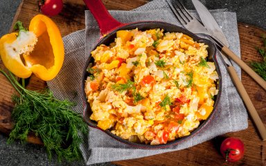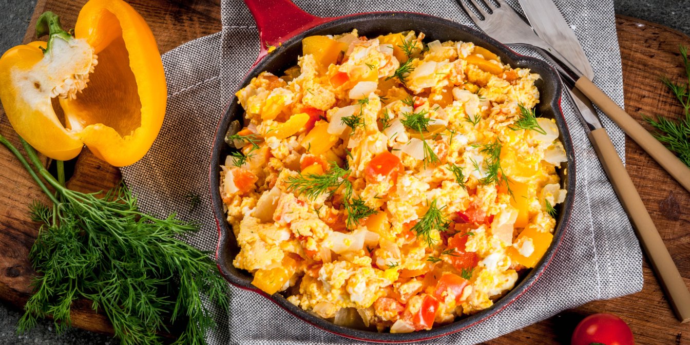Скрембл в мексиканському стилі від шеф-кухаря Марко Черветті — це гармонійне поєднання підсмажених яєць, помідорів, цибулі та кактуса з гострою приправою з чилі. А різкуватий запах кінзи збадьорить вас із самісінького ранку!