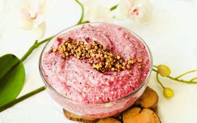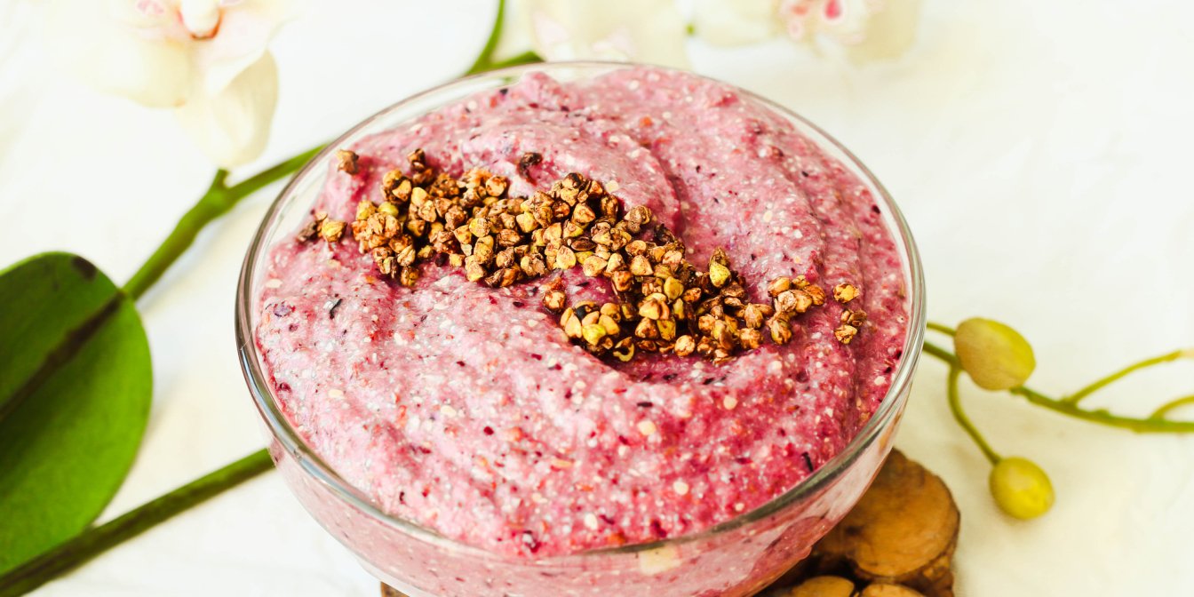 Збийте гречку з бананом до однорідної маси в блендері. Викладіть масу у тарілку та додайте улюблені ягоди, горішки, насіння. Чудовий корисний сніданок готовий!