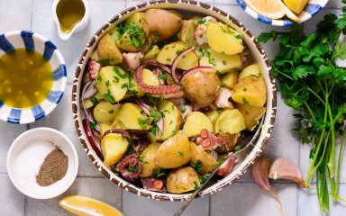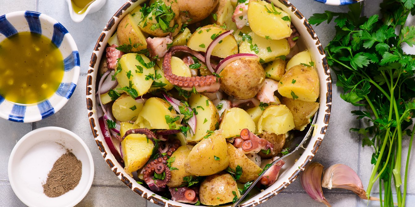 У цьому італійському салаті з восьминогом поєднайте його з дрібною картоплею, червоною цибулею та заправкою цитронет — це соус-емульсія на основі оливкової олії, лимонного соку та петрушки.