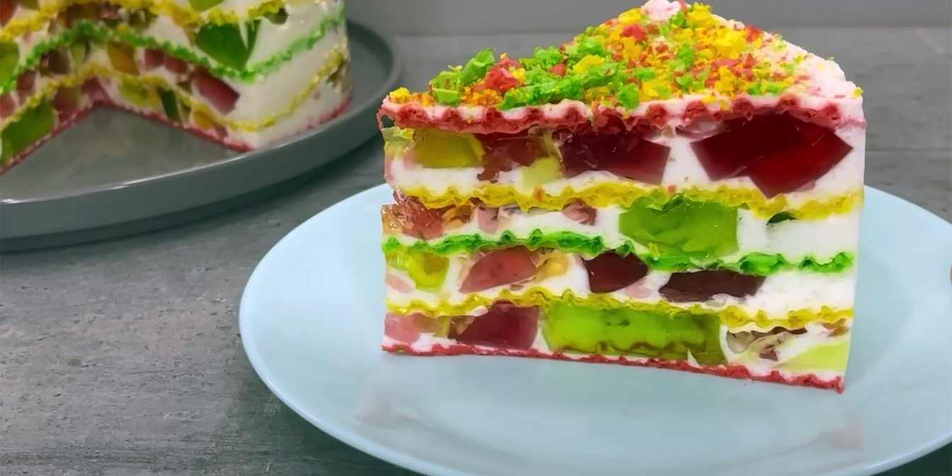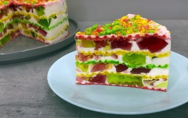 Торт «Бите скло» з вафельними коржами — це яскравий, легкий і святковий десерт, цікавий варіант відомих з дитинства солодощів. Він складається з тонких і хрустких вафельних коржів, ніжного сметанного прошарку та розсипу желе різних кольорів. Торт виглядає дуже ефектно, адже шматочки кольорового желе нагадують бите скло, тому його часто готують до дитячих свят. Використовуйте різноколірне желе з різними смаками, наприклад апельсин, полуниця, вишня, малина, ягоди, ківі, ананас та інші.