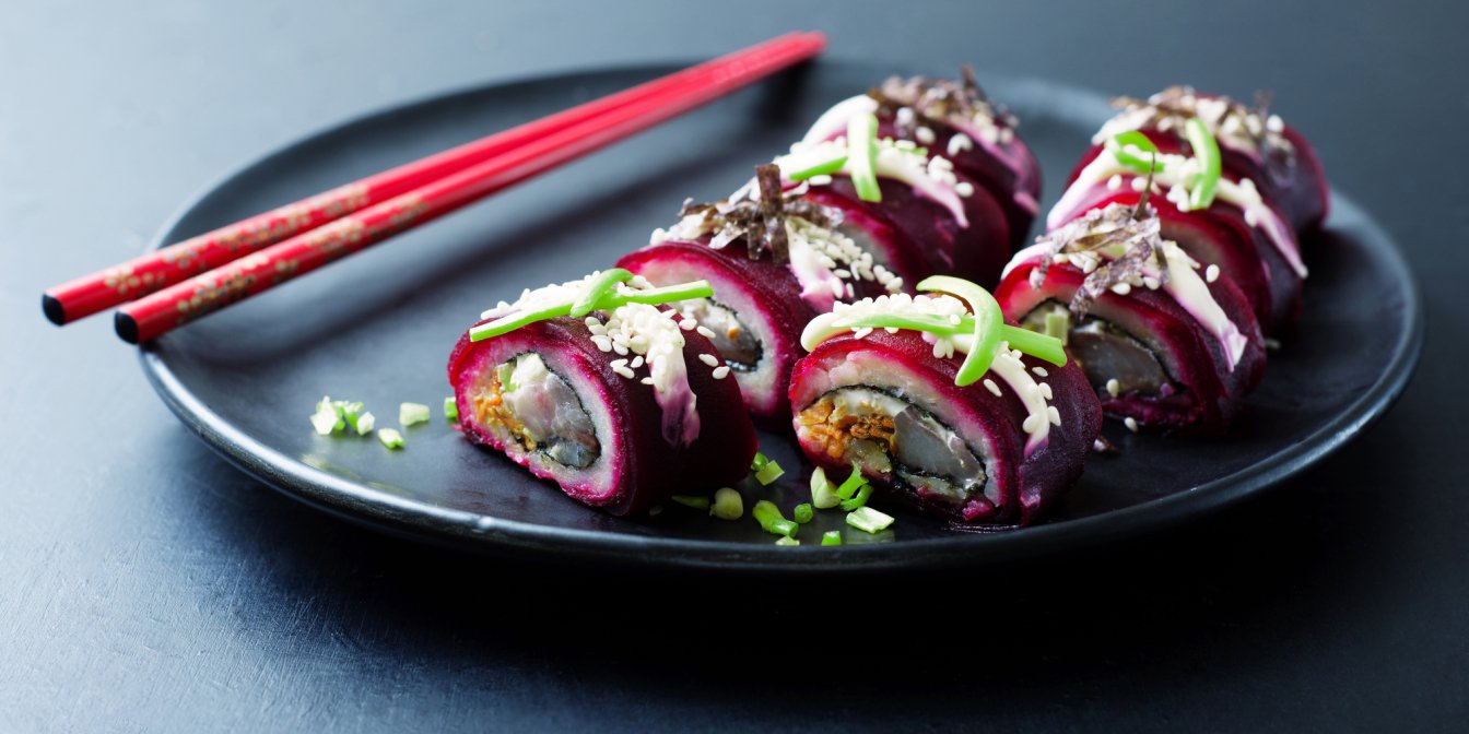 Овочі для ролів з оселедцем потрібно запекти, а яйце відварити. Цей етап у кроках приготування ми пропускаємо. Один буряк наріжемо на слайси, а другий натремо. Не забудьте вичавити сік, якщо його буде забагато.