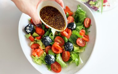 Для заправки зʼєднати сік лимона, соєвий соус, оливкову олію, французьку гірчицю в зернах і мед. Полити салатик і подавати до столу.
