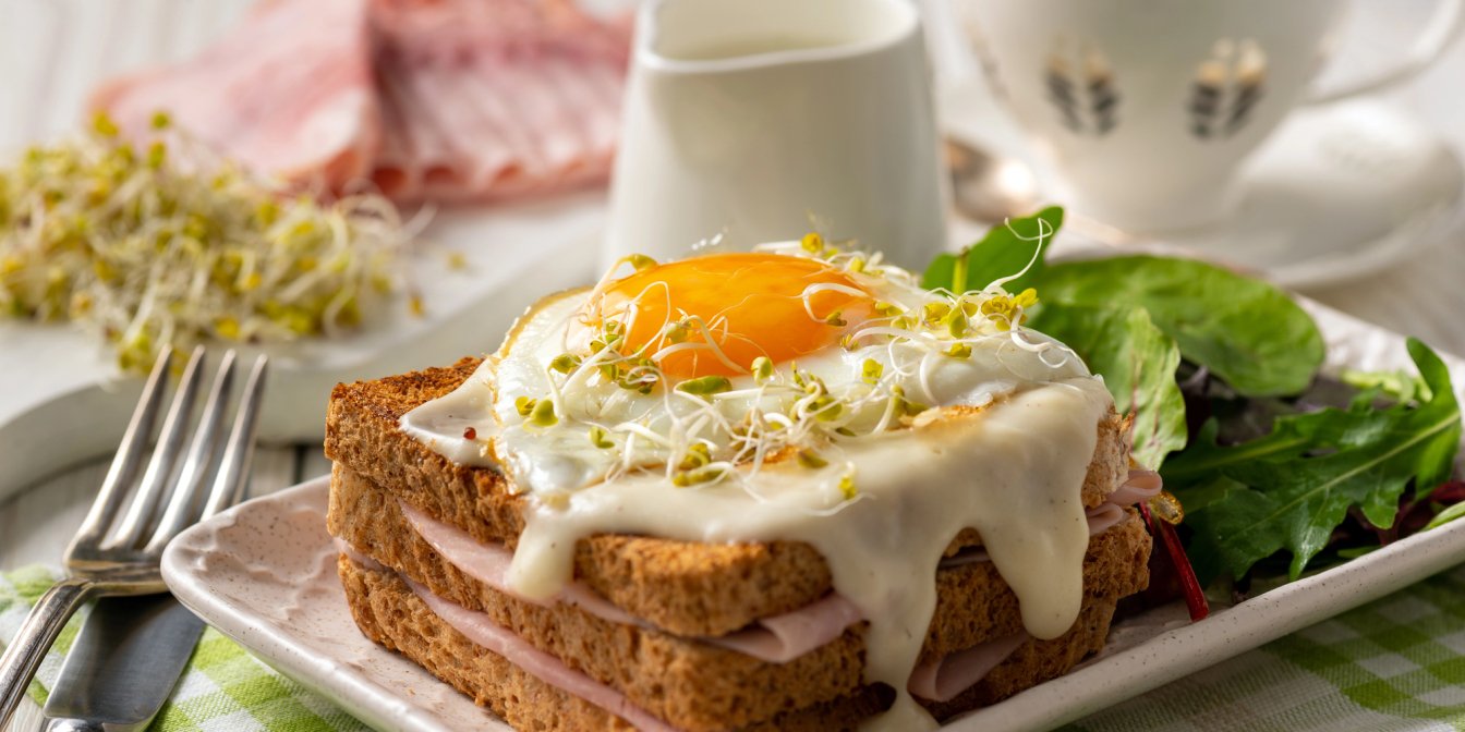 - В цьому рецепті, крім яйця та хліба використовуються шинка, два види сиру — тостовий і моцарела, й інші інгредієнти, які смакують у поєднанні.