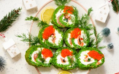 Це дуже красива закуска на день народження або Новий рік, і ця краса готується просто, повірте! Замісимо тісто з борошна, яєць і свіжого шпинату, спечемо корж. Потім додамо начинку з вершкового сиру, слабосолоного лосося та сформуємо наш святковий рулет з червоною рибою та ікрою.