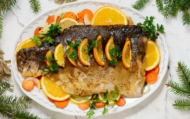 Риба — одна з традиційних страв на різдвяному столі. Її їдять і на Святвечір, і на саме Різдво. Спробуйте запекти коропа чи іншу прісноводну рибу за нашим смачним рецептом. Запечений короп вирізняється ароматом, соковитістю та легкістю приготування. Його часто доповнюють овочами, спеціями, лимоном і травами, що підсилюють смак риби.