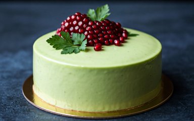 Вийміть торт із холодильника на 15-20 хвилин та залишіть його при кімнатній температурі. Прикрасьте верх торта зернами граната і зеленню.