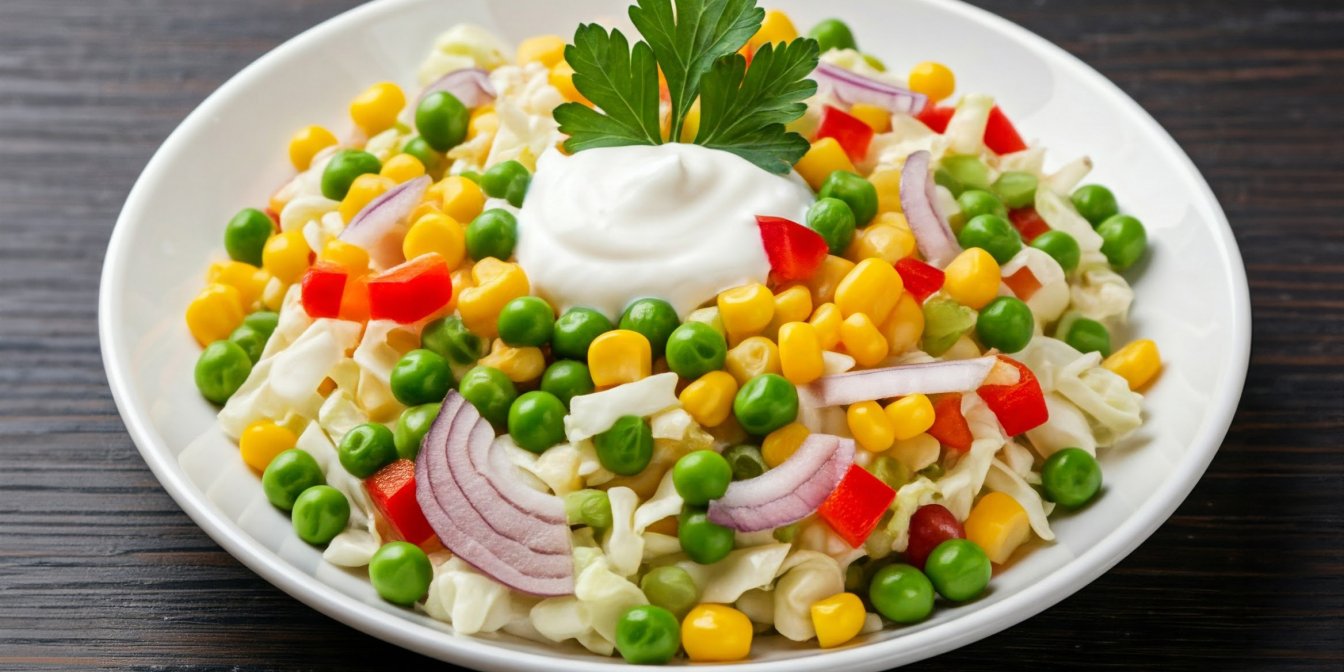Для заправки змішайте майонез і йогурт, приправте сіллю, перцем, невеликою кількістю цукру і полийте викладені шарами овочі. Дайте салату настоятися в холодильнику ніч.