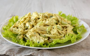 Особливий інгредієнт у рецепті салату «Вершкова курка» — грецький йогурт, що робить його безпечним для фігури. Куряче філе можна відварити зі спеціями або запекти, чи використовувати те, що не доїли напередодні. У нас буде легкий корисний салат з куркою без майонезу!