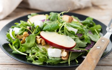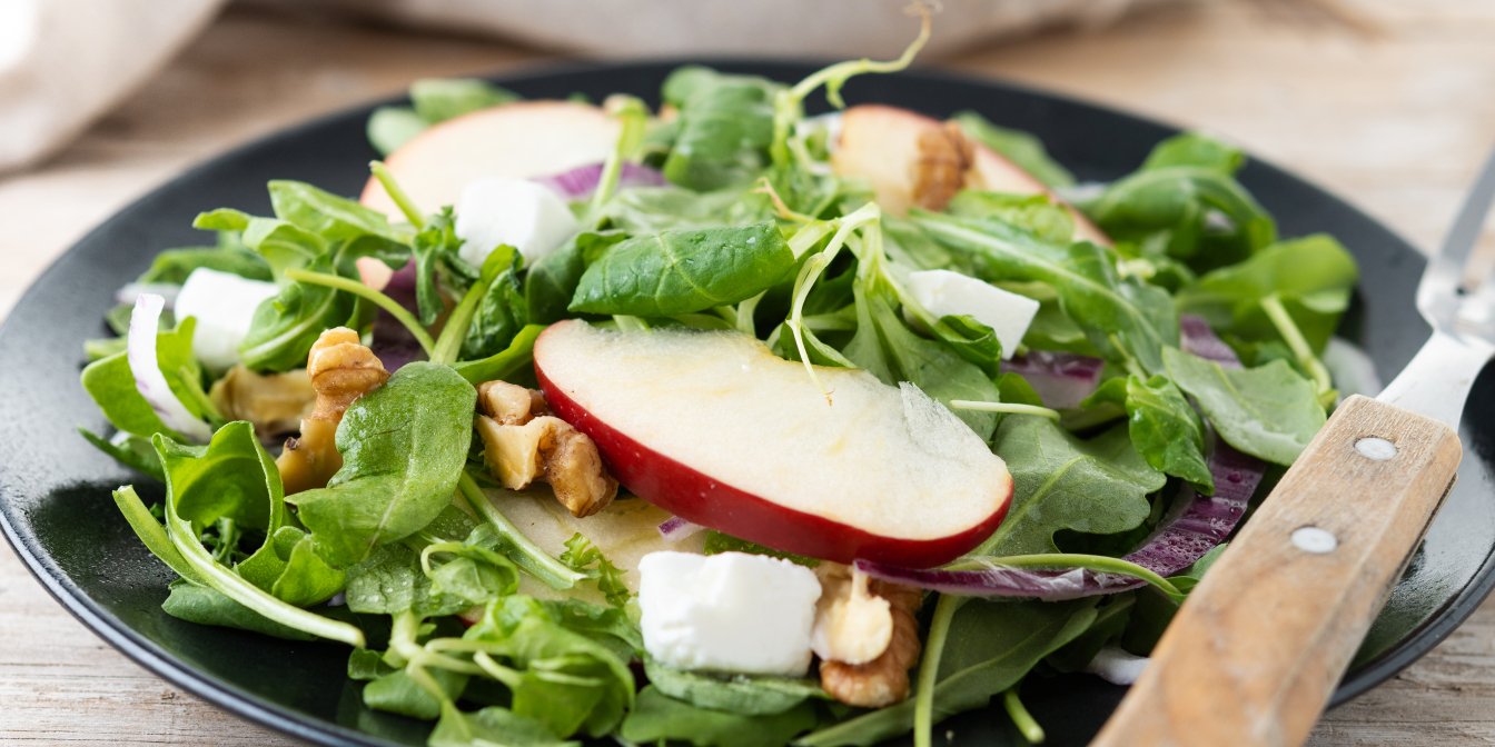 Використовуйте свіжі кисло-солодкі яблука та салатне листя, адже їхня соковитість є ключовою в цьому салаті.