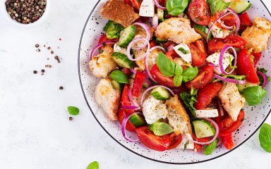 На нашу думку, цей один з найсмачніших салатів з помідорами. Компанію їм складуть свіжі огірки, оливки (зелені) без кісточок, консервований горошок і бринза.