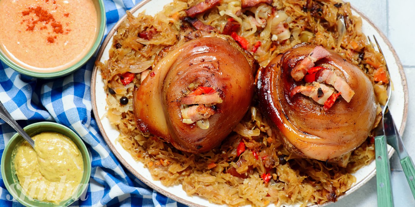 На блюдо виклади капусту, зверху розмісти рульку і наріж її шматочками. Подавай страву з приготовленим соусом.