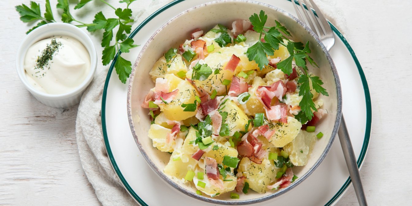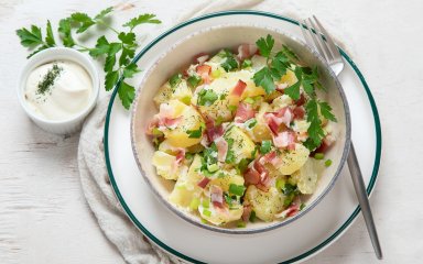 Знаєте тільки про німецький картопляний салат? Час це змінити! Картопля в сметані по-німецьки — класичний гарнір, відомий своєю кремовістю, ситністю та ніжним смаком. Для приготування знадобиться відварена або запечена картопля, сметана для соусу і шинка. Хоч страва проста, але ви не зупинитесь, поки не побачите дно тарілки — запевняємо!