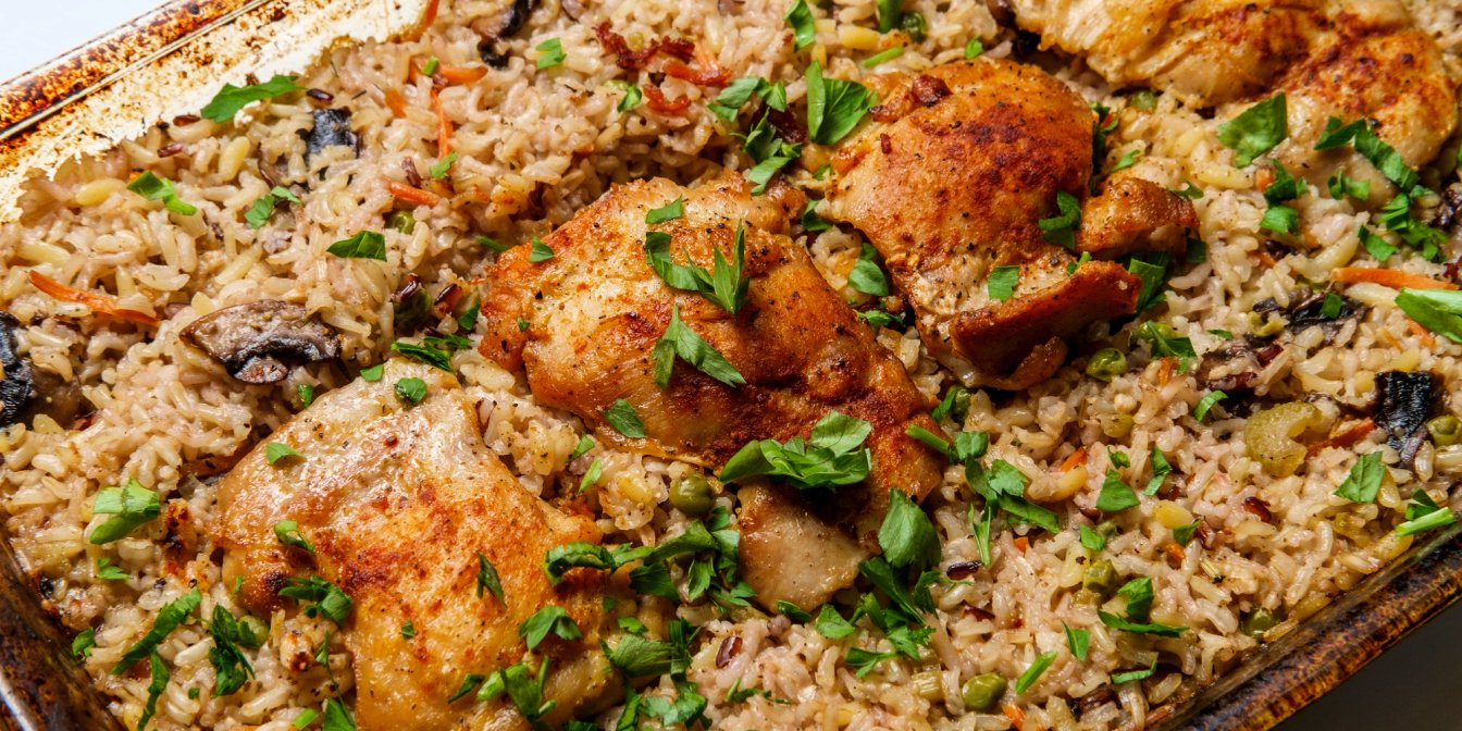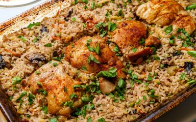 Зазвичай рецепти з курячими стегенцями мають гарантований успіх: це ситно, швидко, просто та універсально. Цей рецепт — не виняток. Ми пропонуємо приготувати курячі стегенця з рисом з додаванням яскравих близькосхідних спецій. За аромат і надзвичайний смак відповідають майоран, чебрець, зіра та орегано.