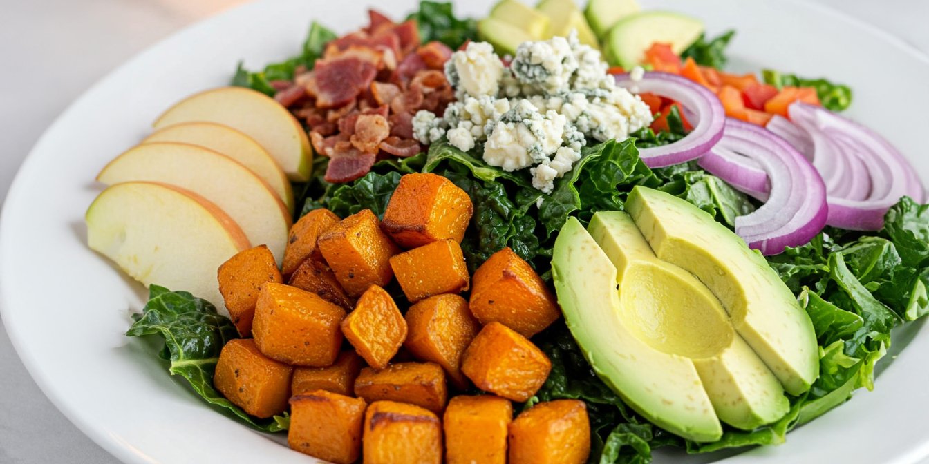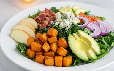 Класичний салат кобб народився в США, а в європейських країнах він зазнав смачних трансформацій. Наприклад, у цьому рецепті сезонний гарбуз замінить куряче м’ясо. Решта інгредієнтів — яйця, яблуко, авокадо, сир з блакитною пліснявою і трохи смаженого хрумкого бекону.