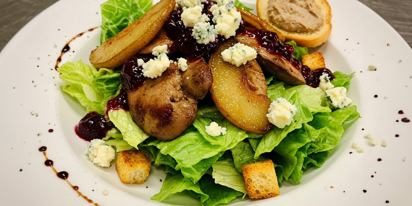 Це вишуканий теплий салат із ніжною курячою печінкою, покритою ароматним ягідним соусом із вишні та малини. Додаткову нотку смаку додають карамелізовані груші й сир горгонзола, які гармонійно поєднуються зі свіжістю зелені та заправкою на основі оливкової олії й прованських трав. Хрусткі грінки з шаром печінкового паштету роблять страву ще більш витонченою та ситною.