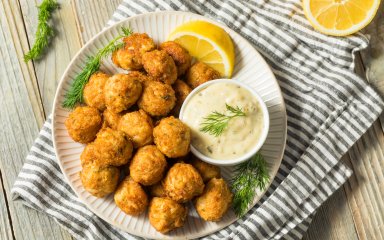 Делікатні рибні тюфтельки, запечені в духовці, подаються з легким йогуртовим соусом. Він також містить білок, але при цьому є менш калорійною альтернативою, ніж майонез або жирна сметана.