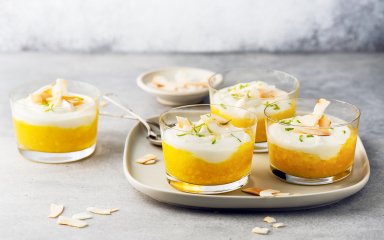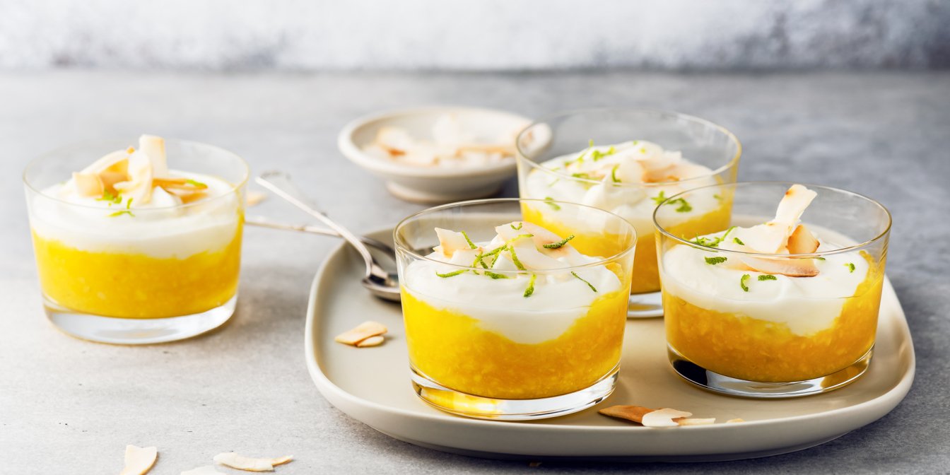 Готовий крем перекладіть по склянках. Прикрасьте апельсиновою цедрою, шматочками фруктів і свіжою м’ятою.